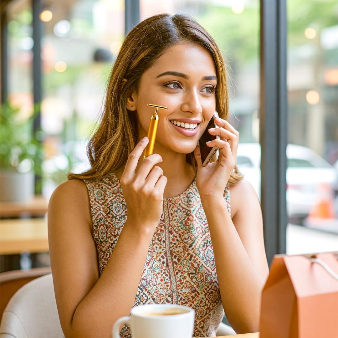 • Anti-Aging & Wrinkle Reduction : The gentle vibrations help reduce the appearance of fine lines and wrinkles by contributing to natural skin firmness. This 24K gold massager for face supports firmer, smoother, and youthful-looking skin.
