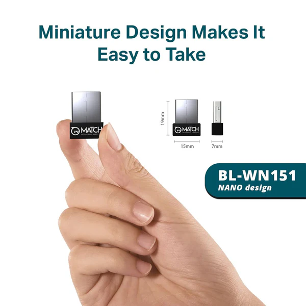 Wi-Fi connector with 150mbps and nano design, lets you connect to the fast internet and enjoy surfing. Nano USB Adapter of Match LB-Link provides high-speed Internet, files transfer, and media streaming on PC and Laptop. This WiFi adapter can be left plugged in PC and Laptop. Just Plug & Play.