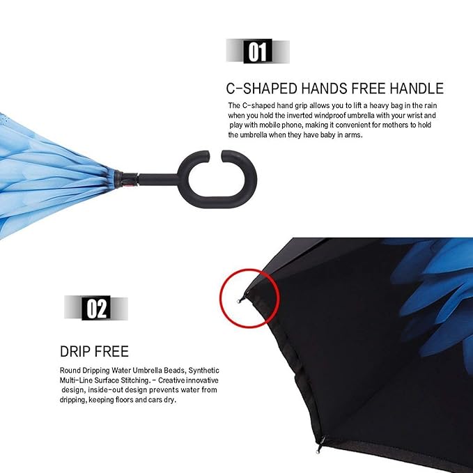 • Unique Design: Unique design of double inverted umbrella, inside-out design prevents water from dripping, keeping floors and cars dry.