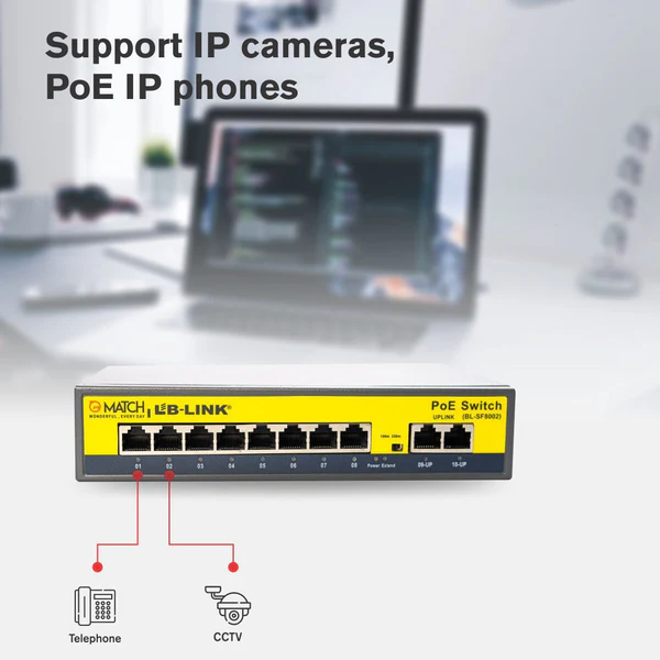 8 Port PoE Switch with 2 Uplink Ports of Match LB-Link. This PoE switch saves power cables and costs. Get reliable and authentic data transmission. Easy Installation.