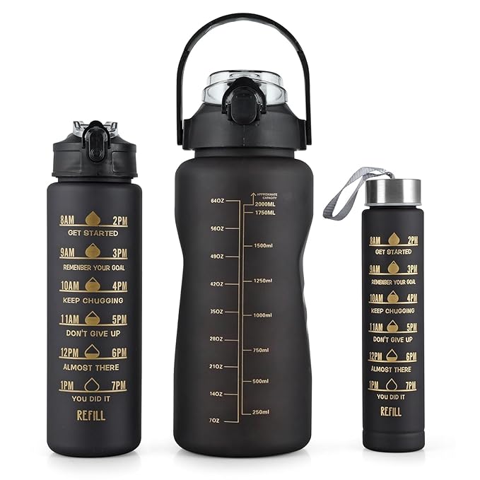 3in1 Motivational Water Bottle 2000ml 900ml 300ml Plastic Water Bottle Set Of 3 Piece Gym Sports Bottles With Time Marker BAF free (Black with golden fonts moativtional quotes)