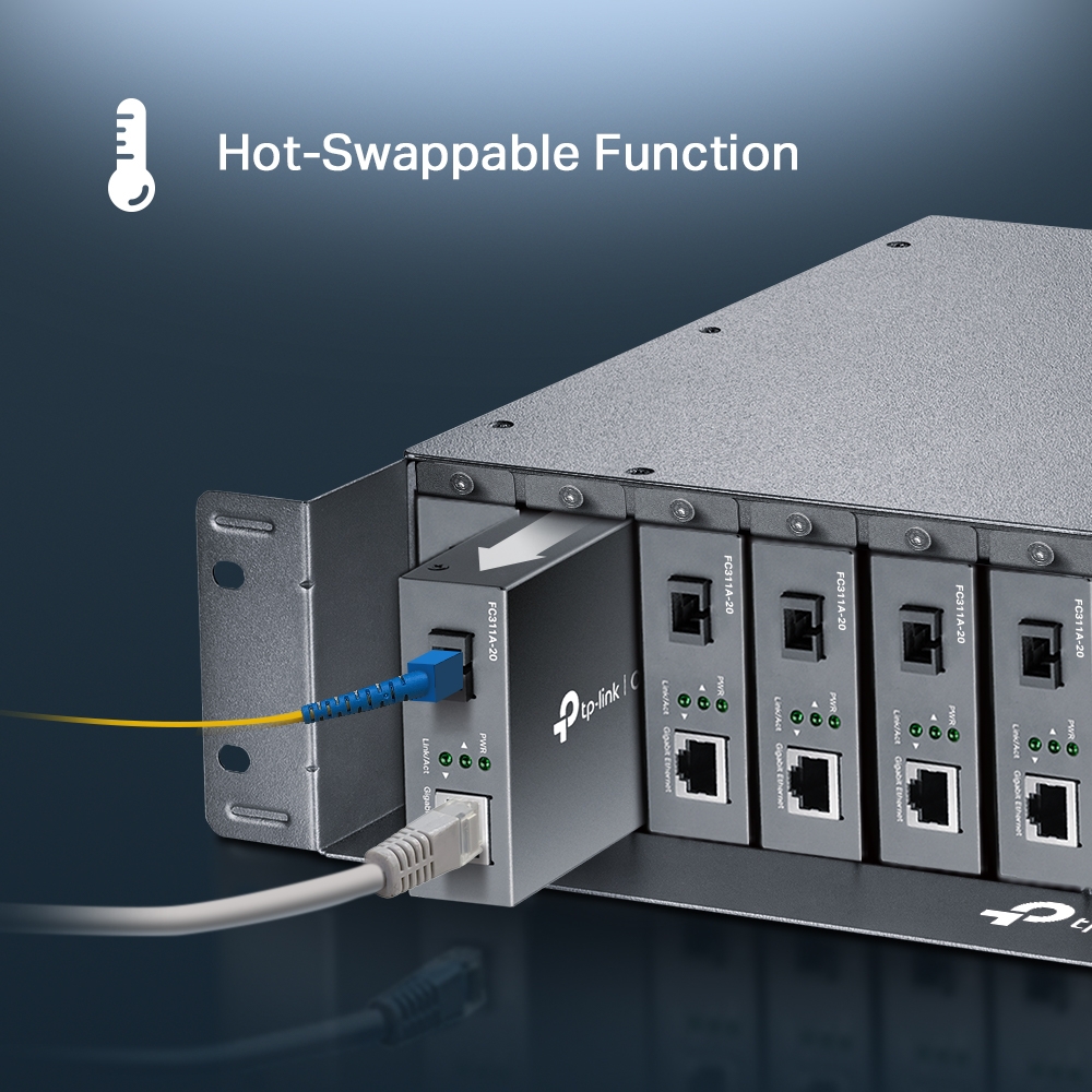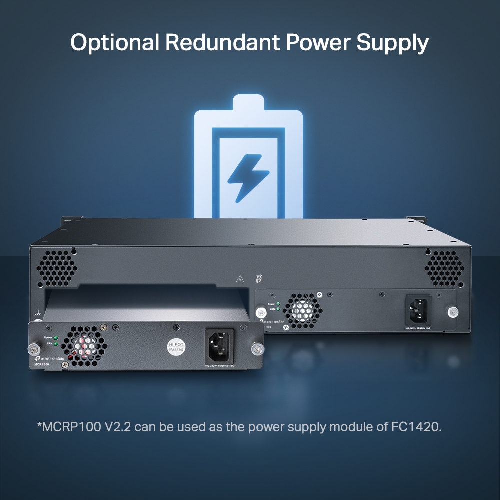The FC1420 (TL-FC1420) 14-Slot Rackmount Chassis is specially designed to accommodate 14 TP-Link’s Media Converters for central power supply, saving space and power cables. Continuous operation is of great importance to fiber communication, so the chassis is equipped with optional redundant power supply and Hot-Swapping function which allows installing/removing the converter without powering off the chassis. Moreover, to stabilize the performance and extend the lifetime, there is a cooling fan installed inside the original power supply. Together with FC series Gigabit / Fast Ethernet media converters, FC1420 (TL-FC1420) is the ideal solution for your media conversion network.