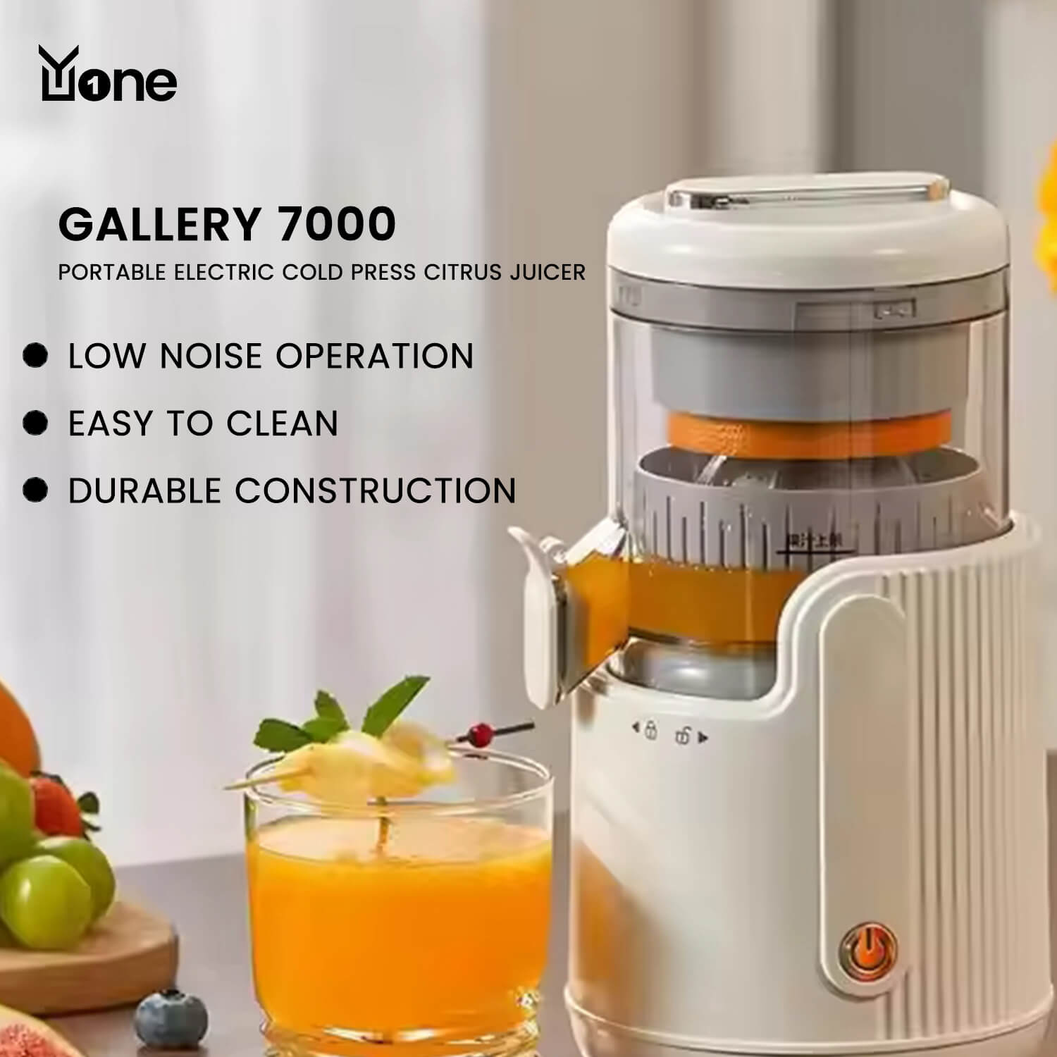Yuone Gallery 7000 Portable Electric Cold Press Citrus Juicer is designed for efficient, healthy juicing at home. Its slow juicer technology maximizes juice yield from citrus fruits while minimizing waste. With a durable stainless steel housing and blade, it ensures longevity and easy maintenance. This juicer is lightweight, features a non-drip spout for mess-free pouring, and is quick to clean. Operating at a low noise level, it’s perfect for early mornings or late nights without disturbing others. Compact yet powerful at 180 watts, this juicer combines durability and convenience by YuOne